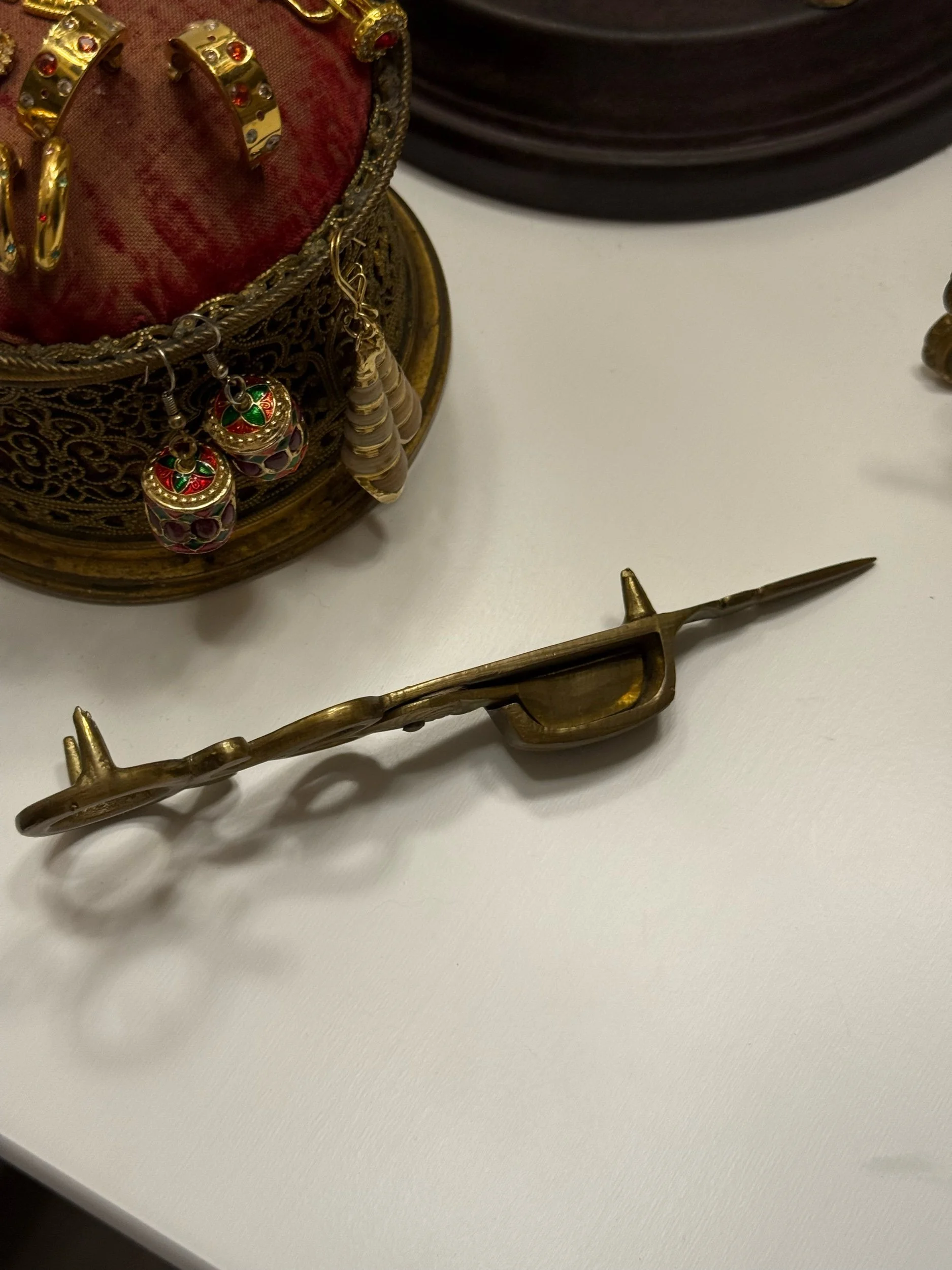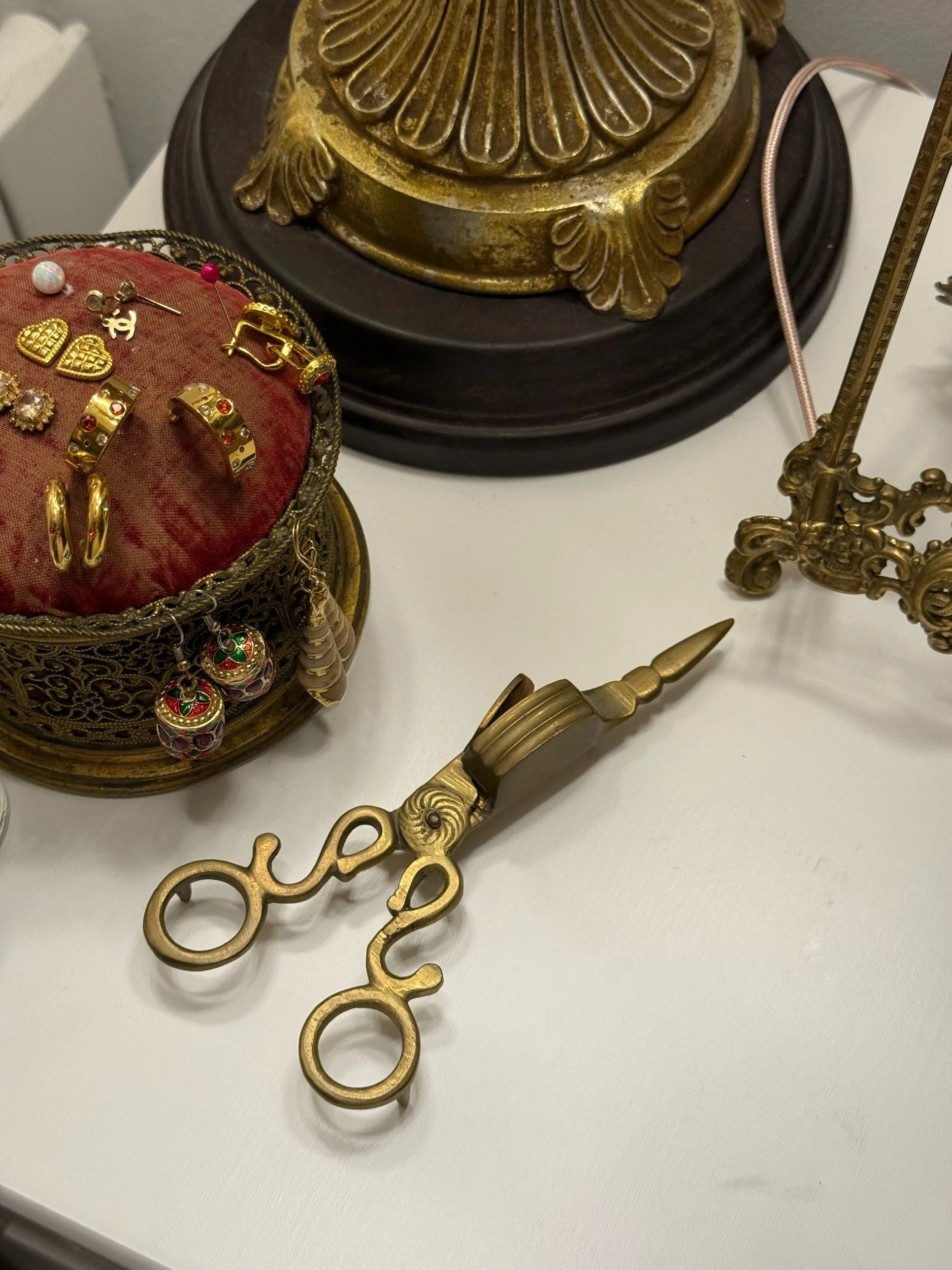 Dekorative Vintage Dochtschere aus massivem Messing, traditionell verwendet zum Kürzen von Kerzendochten. Die Schere besitzt die typische Auffangmulde für den Dochtrest und liegt gut in der Hand. Die schöne Patina und die geschwungene Form verleihen dem Stück einen authentischen historischen Charakter.