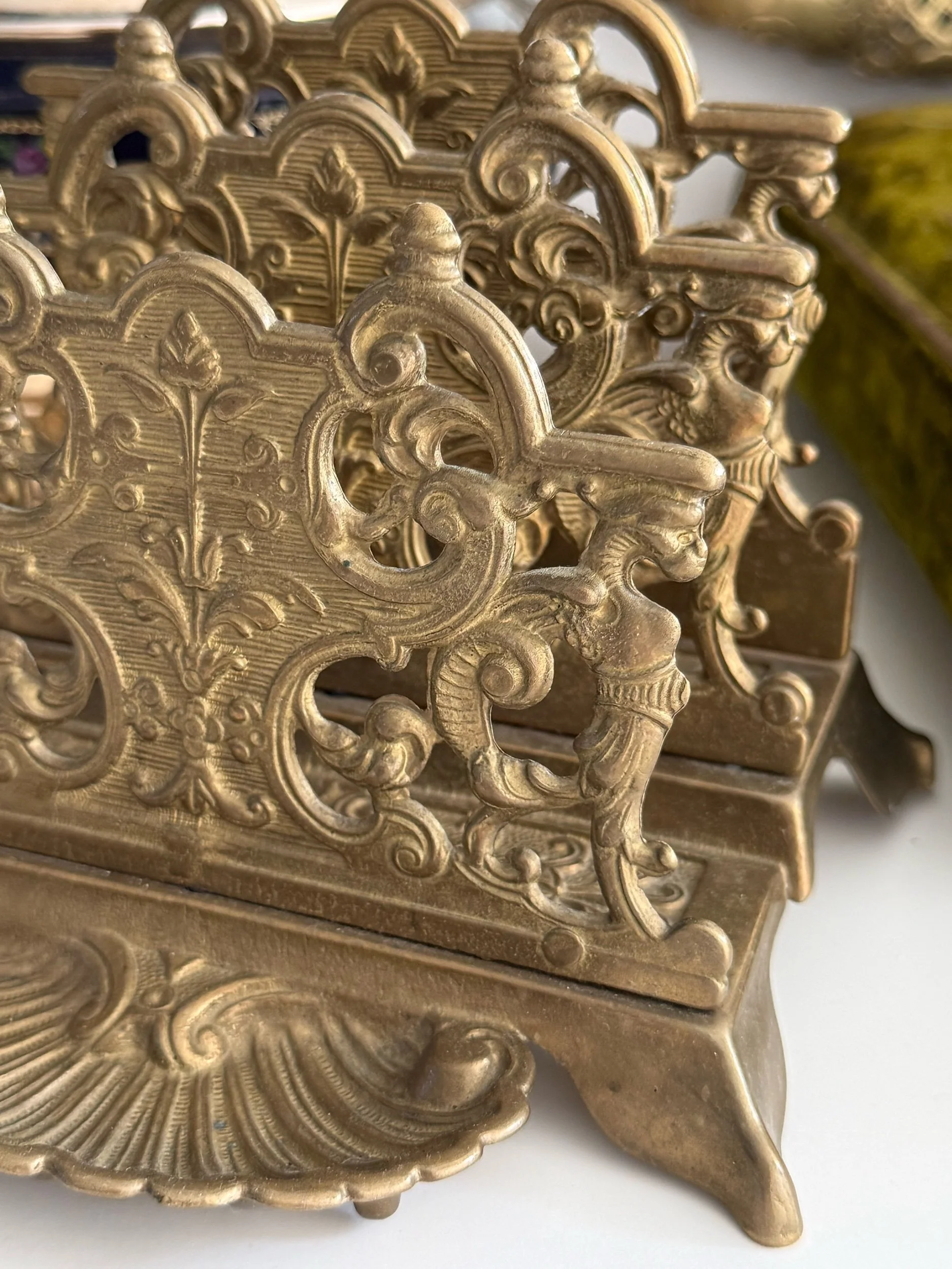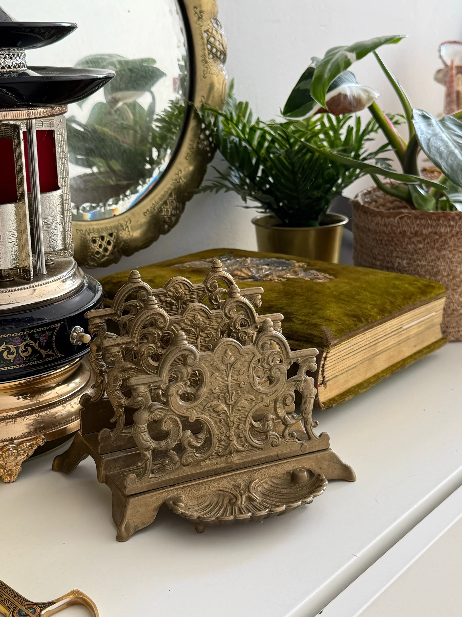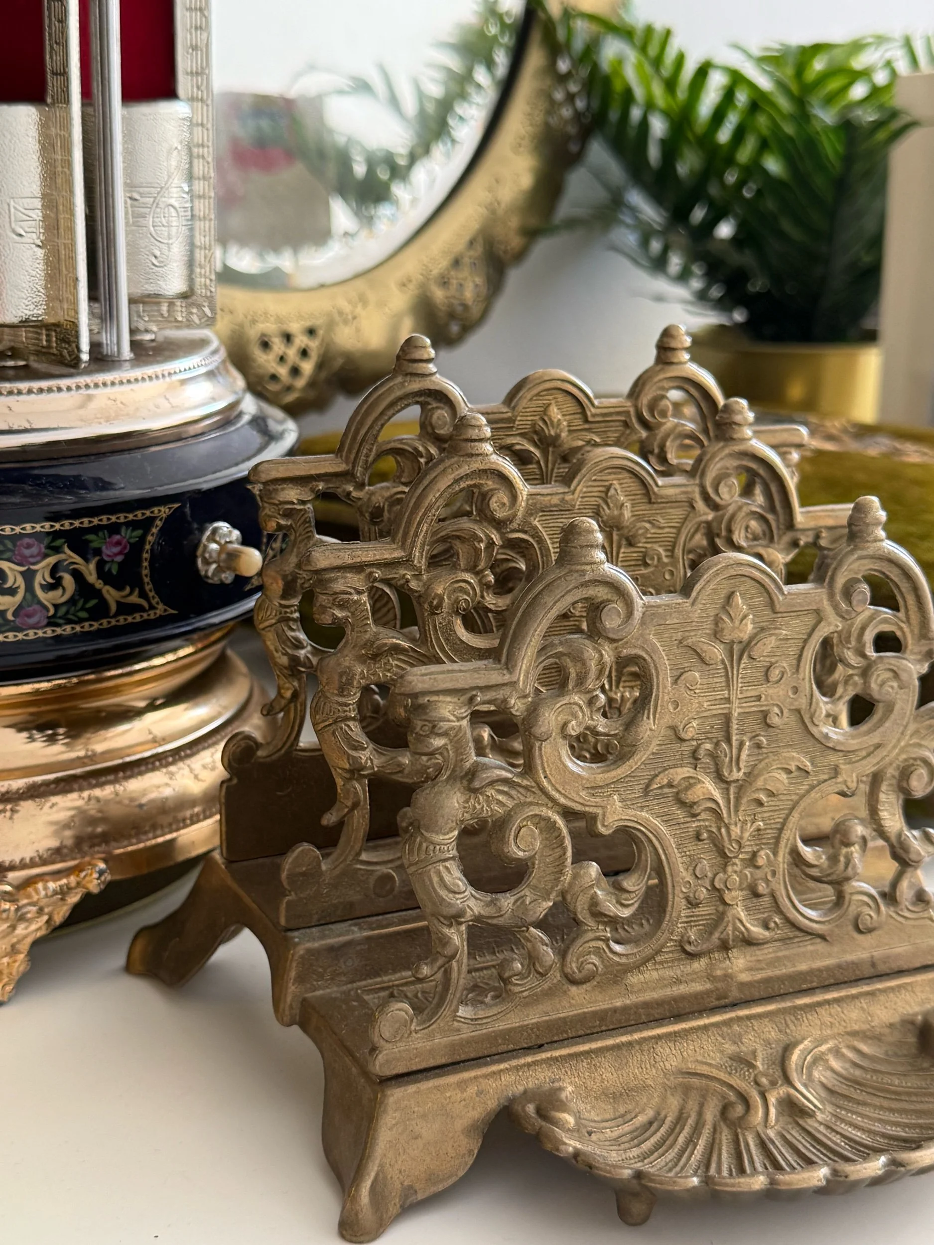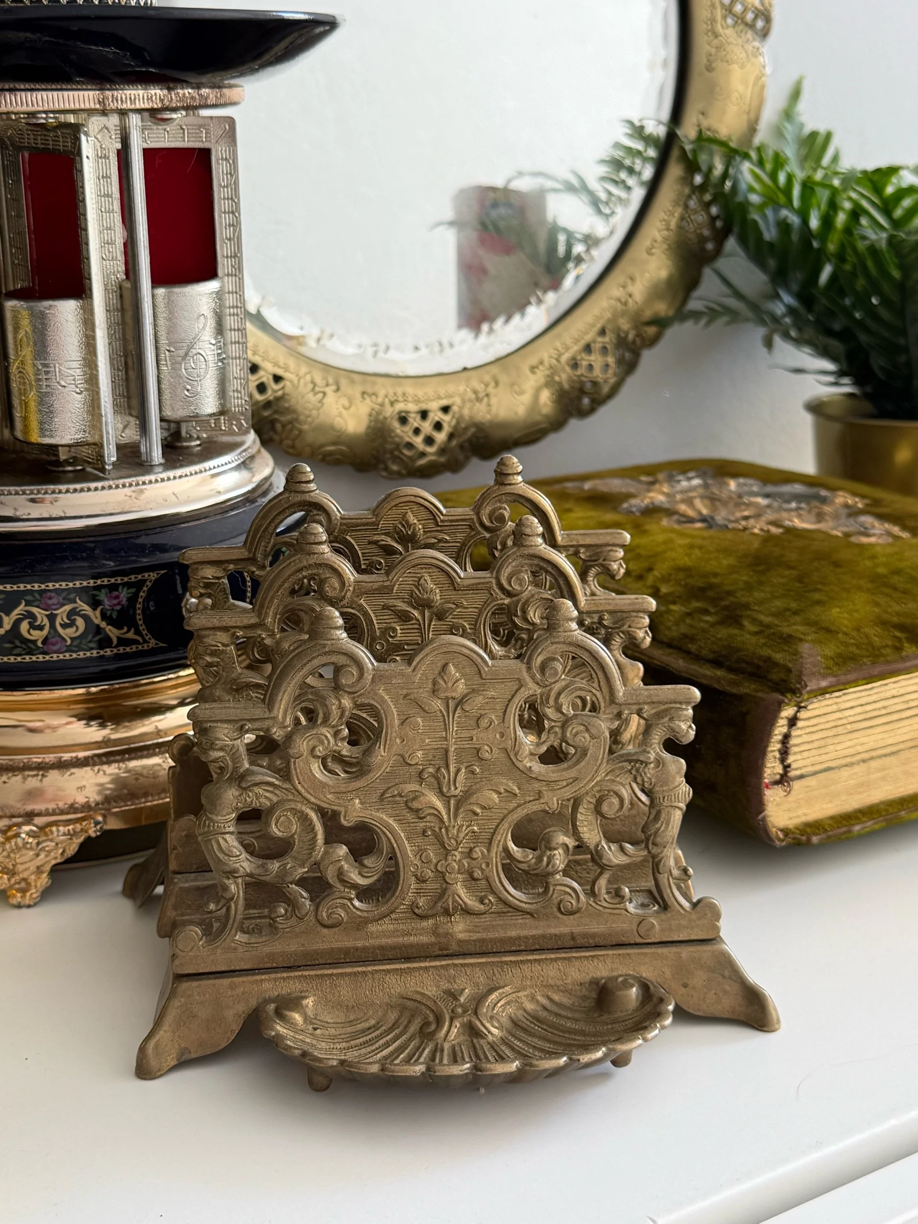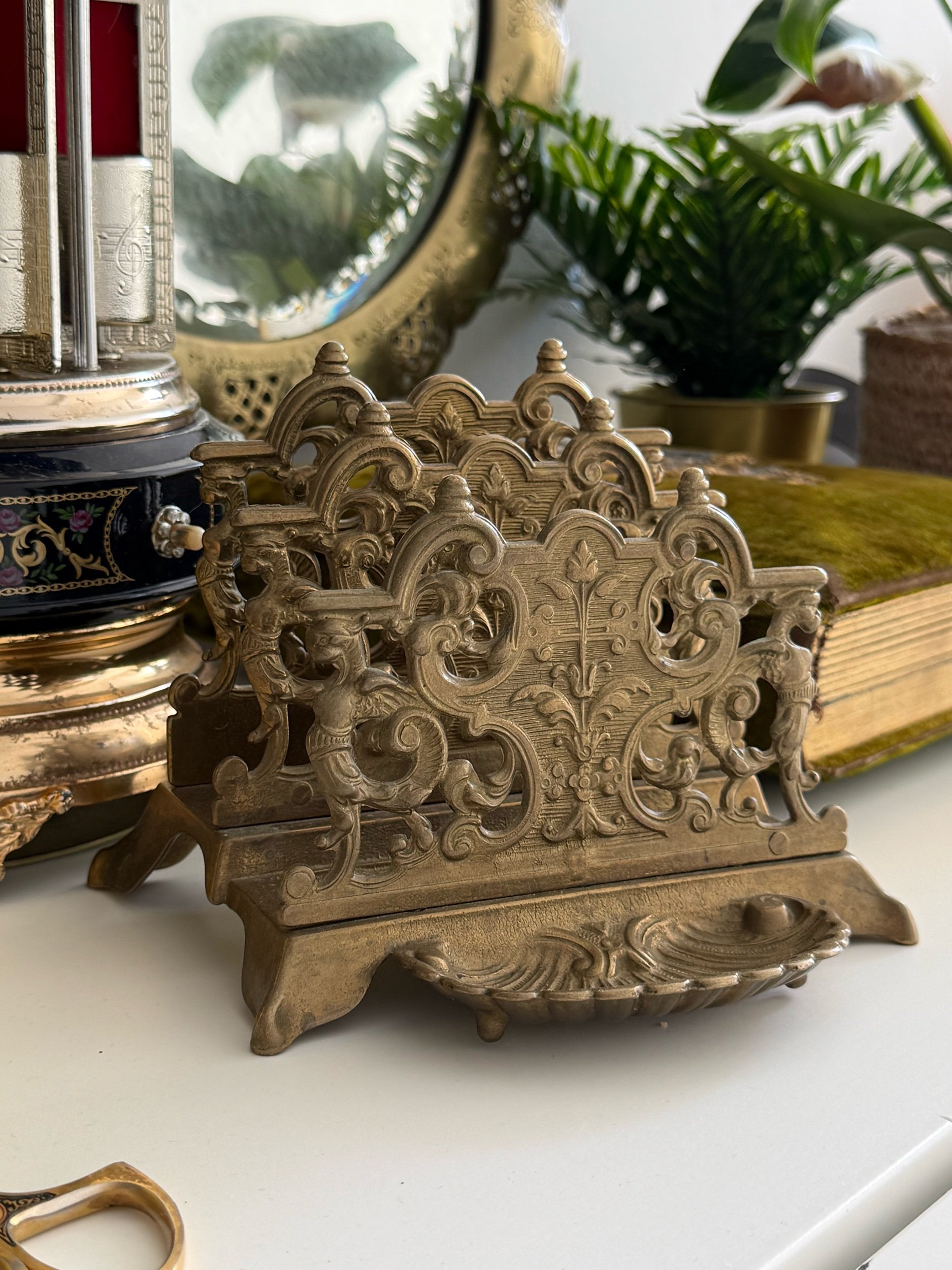 Dieses außergewöhnliche Stück besticht durch seine filigranen Ornamente, geschwungenen Formen und detailreichen Figuren, die typisch für die Zeit um 1880–1910 sind.